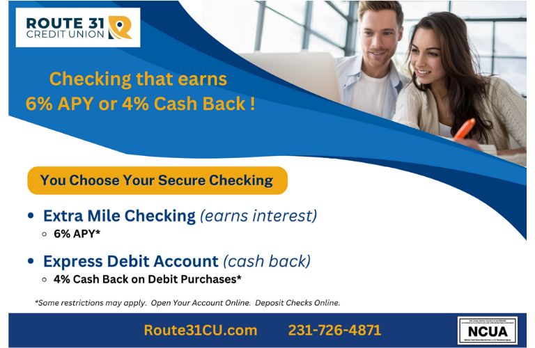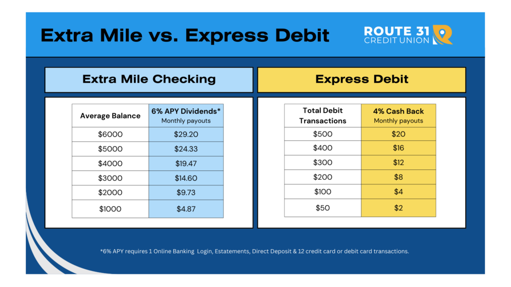 Route 31 Credit Union offers 6% APY on your Extra Mile Checking Account balance up to $6,000! (see requirements below).